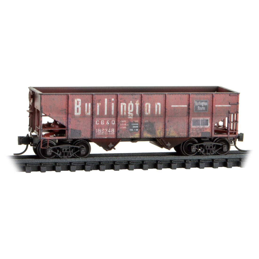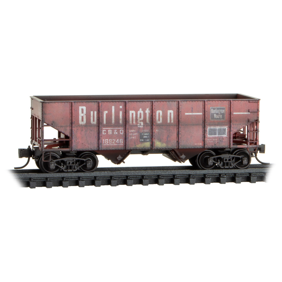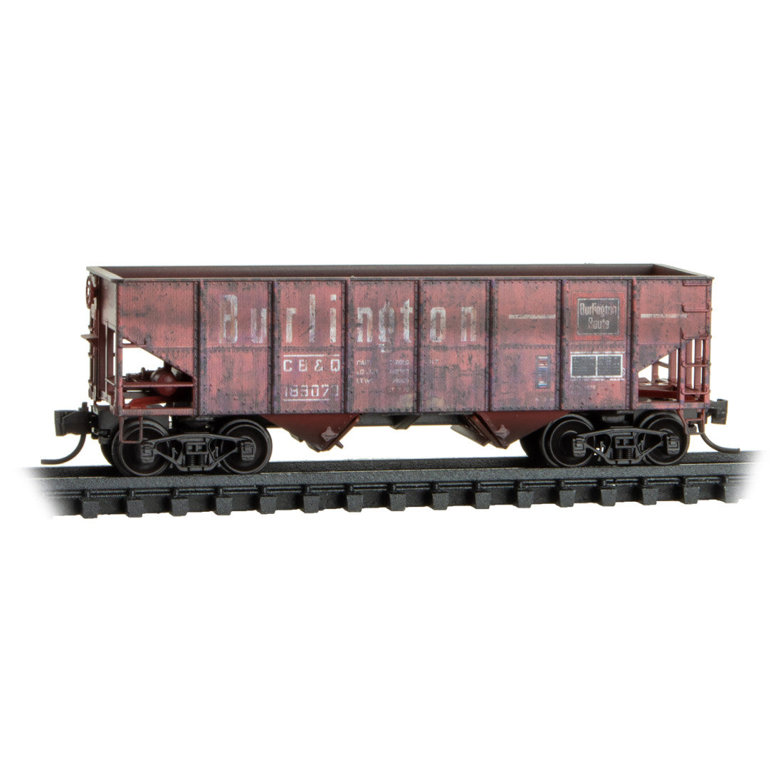 These 55-ton steel open hoppers were produced by the CB&Q’s Havelock Shops in 1945, and were designed for coal service. The CB&Q, commonly known as the Burlington, was founded in 1849 and was based in Chicago, Illinois. In the 1970s, it was merged with the Great Northern, Northern Pacific, and SP&S to form Burlington Northern, which is now part of BNSF.