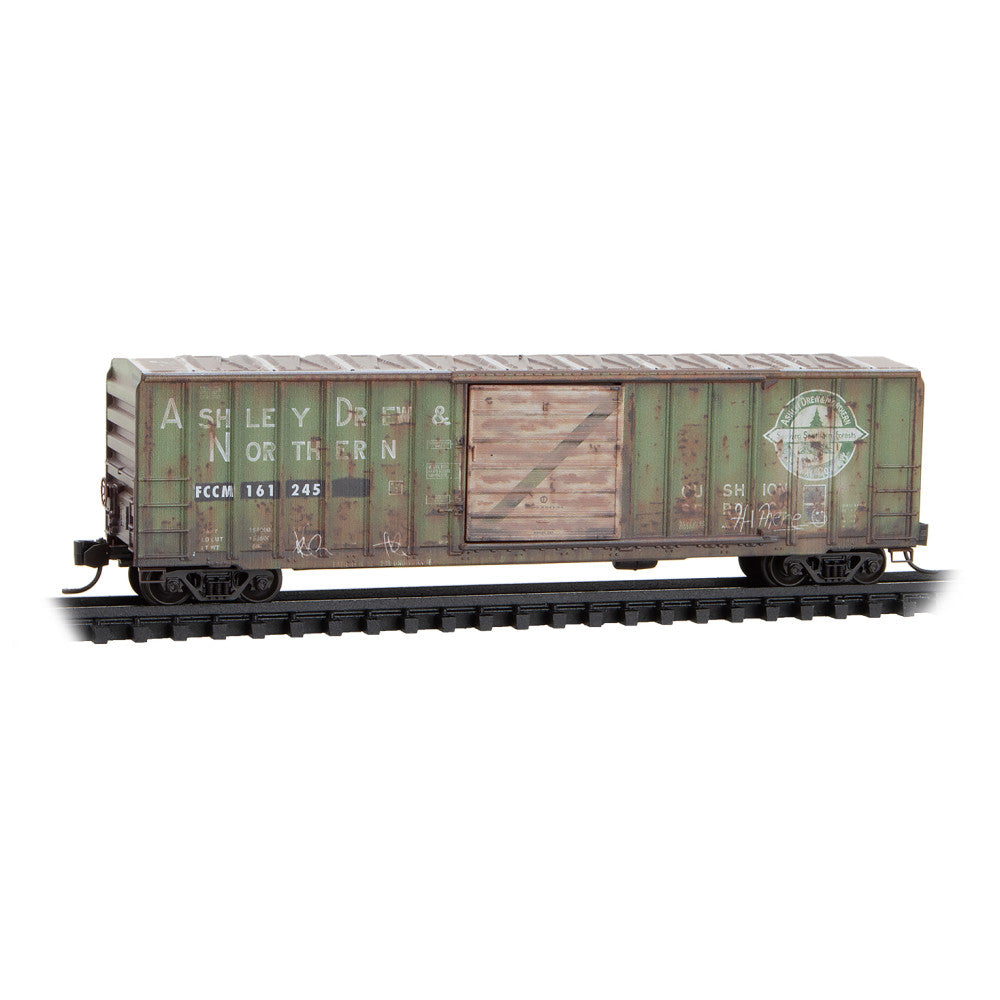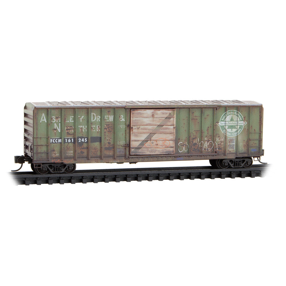 Ashley, Drew and Northern was a short line logging railroad founded in 1905 in eastern Arkansas. Pulpwood and paper products became the railroad’s staple freight commodity by the mid-1940s. In 1963, Georgia Pacific Paper Corporation purchased the railroad but continued to operate it under the AD&N name until 1995 when it was no longer profitable and was abandoned. The car was later obtained by Ferrocarriles Chiapas-Mayab of Mexico, which was founded in 1999 and operated until 2007(053 00 760) 60' center beam flatcar produced by Micro-Trains, a USA manufacturer of N scale model railroading supplies.