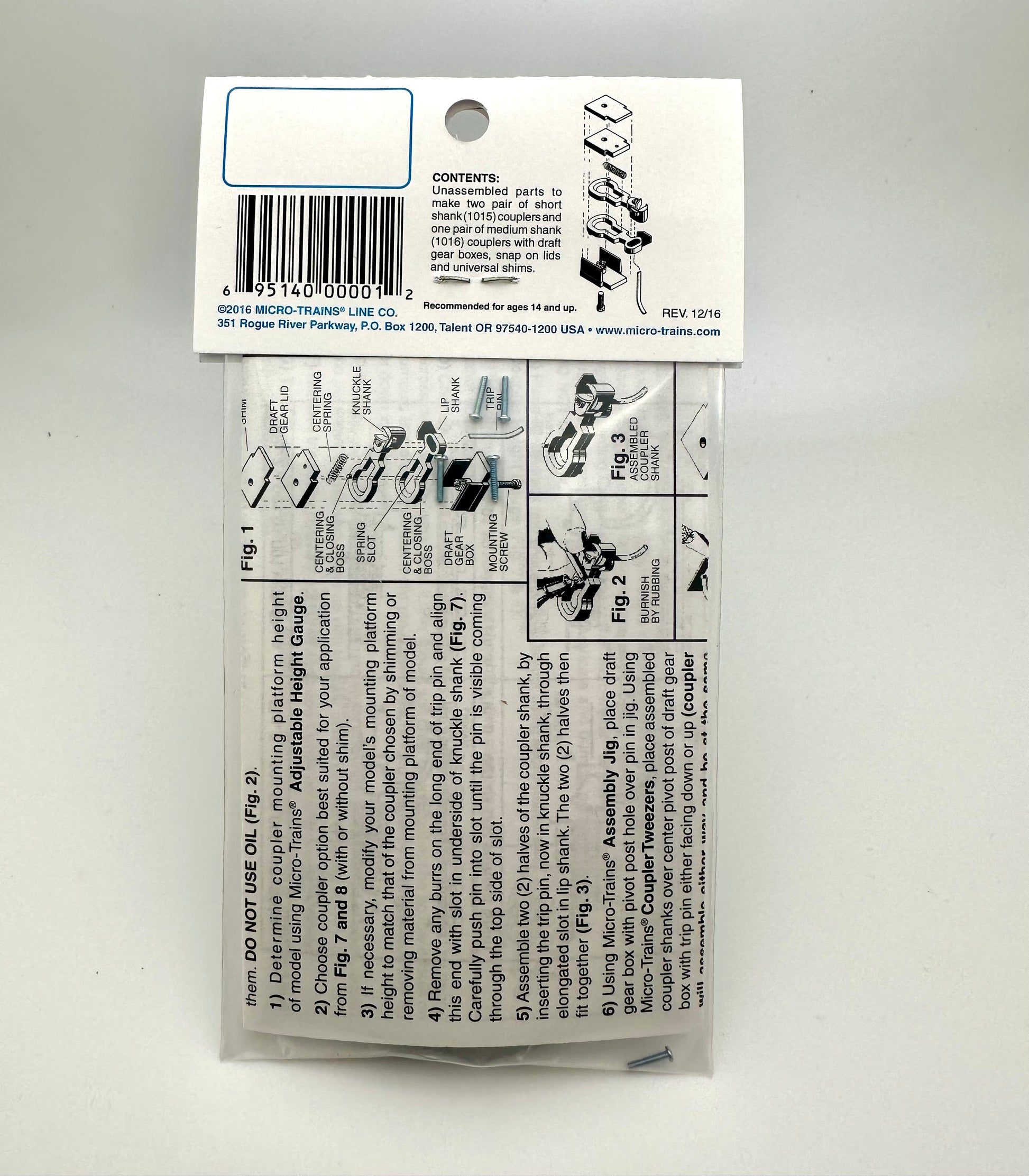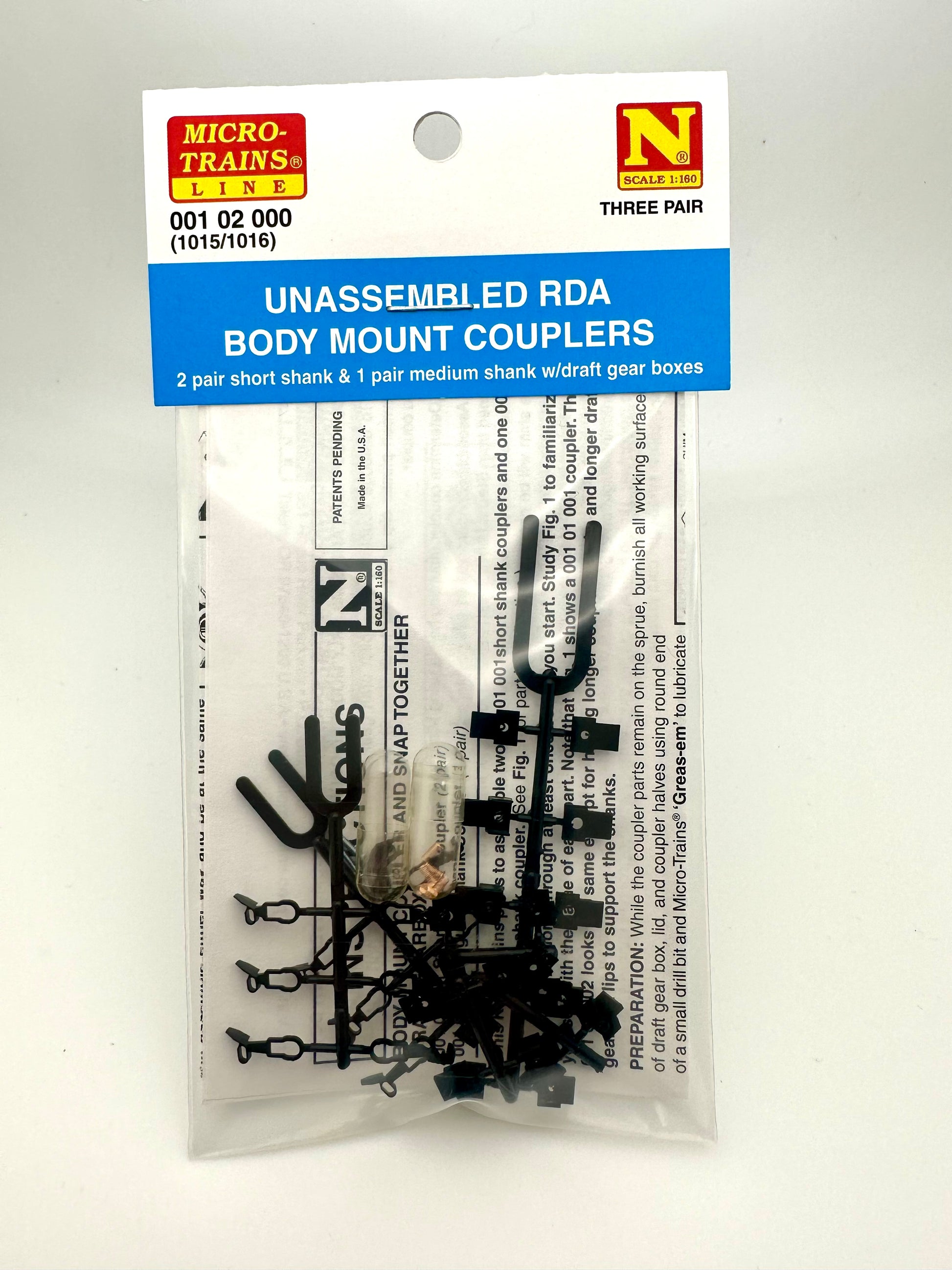 Unassembled RDA Body mount couplers. 2 pair short shank & 1 pair medium shank with draft gear boxes.